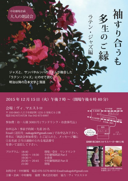 中村劇場大人の朗読会シリーズ第ニ弾。大人の男女の出会いや別れの世界を描いた選りすぐりの明治以降の日本文学や落語を、選りすぐりの音楽をBGMに、凝った演出でお聴きいただく大人の朗読会。今回は、サンバやルンバのリズムとジャズが融合した「ラテン・ジャズ」にのせて、艶っぽい話をご堪能いただきます。