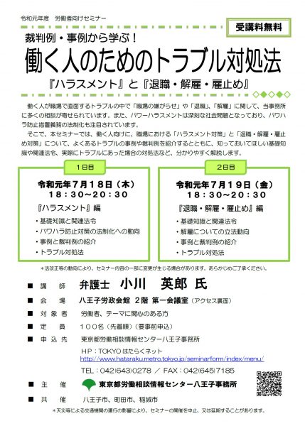 東京都は、7月18日、19日に、セミナー「裁判例・事例から学ぶ!働く人のためのトラブル対処法『ハラスメント』と『退職・解雇・雇止め』」を開催します。