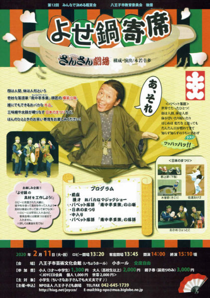 観客を楽しませることにかけては定評のある、ながたひとし、加藤K子らのさんさん劇場「よせ鍋寄席」。親子でも大人でも楽しめて笑える70分!
